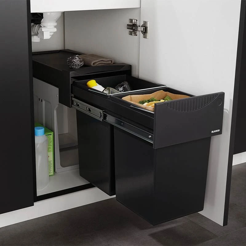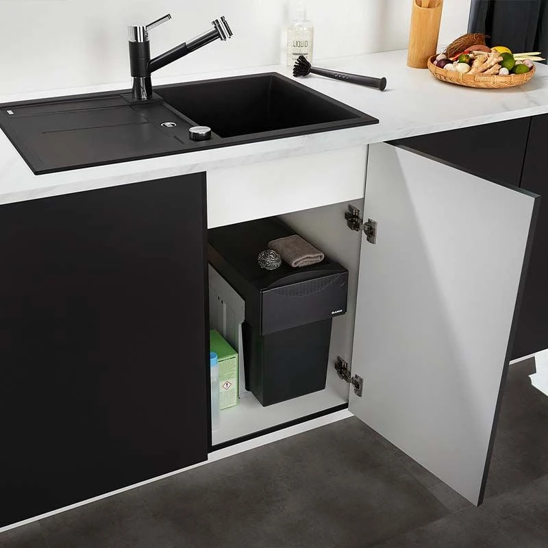 The Blanco BOTTON II 30/2 Waste Sorter for 300mm Base Cabinet boasts a large waste volume container despite compact dimensions, and can be flexibly positioned in the base cabinet.