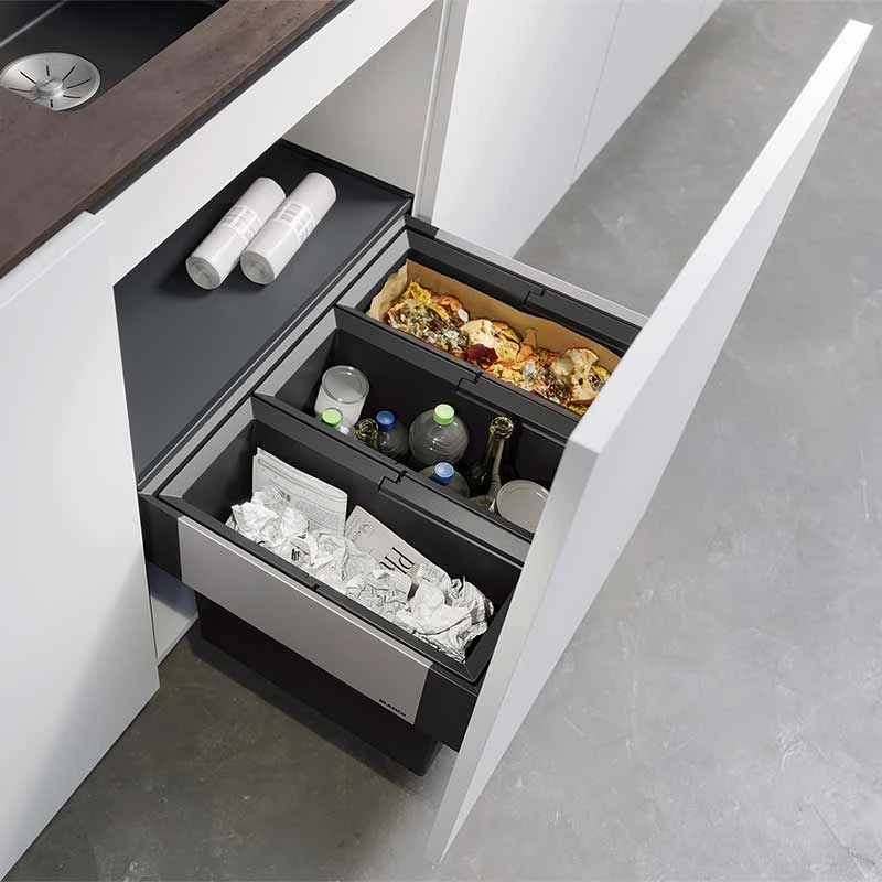The Blanco SELECT II 60/3 Waste Sorter for 600mm Base Cabinet boasts a modern, harmonious and functional design, with high quality pull-out system.