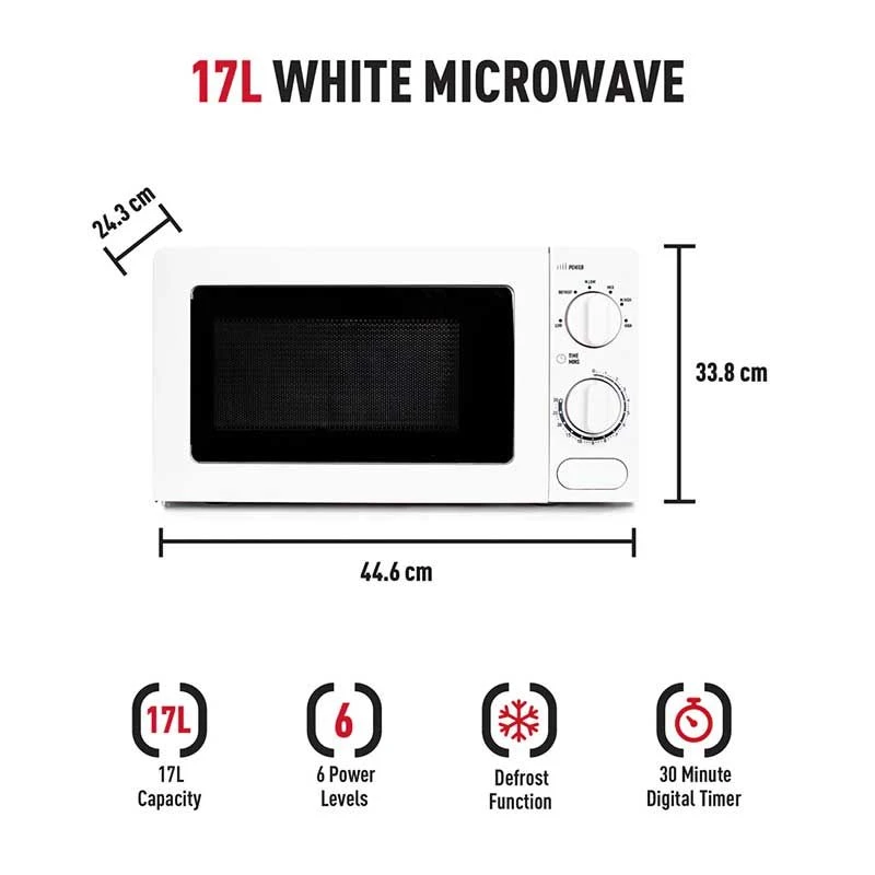 The Haden 195630 17 Litre Microwave features easy to use mechanical controls and 30 minute minder alerts so you know when your food is ready. It also has 6 power levels for controlled heating and a defrost button to help make preparing food just that bit easier. This product also comes with a 2 year manufacturers guarantee for your peace of mind.