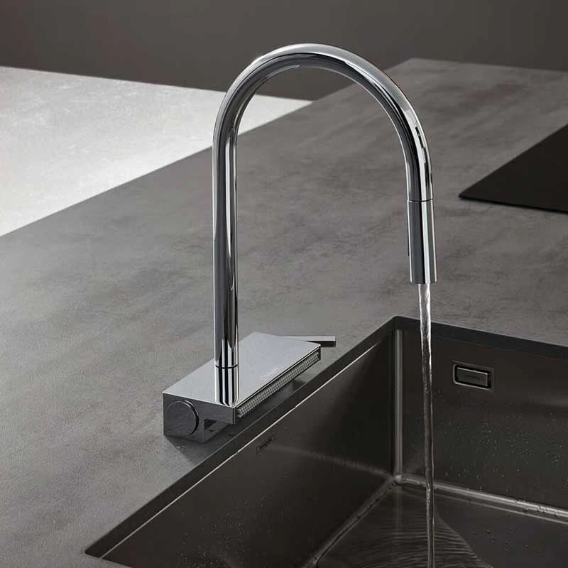 The hansgrohe Aquno also features a LaminarSpray, ShowerSpray and SatinFlowSpray. The LaminarSpray is a crystal-clear spray type with no added air for the sink. This spray is a great help when going through the day-to-day kitchen routine, e.g. quickly filling large pots or bowls. Efficient with very little splashback. The ShowerSpray has a soft spray which helps to gently yet efficiently clean food and other items. The SatinFlowSpray is a micro-fine, resource-saving spray type that can be used to clean sensitive foods extremely gently. The wide water spray flows from the base of the tap, causing very little splashback in the sink.