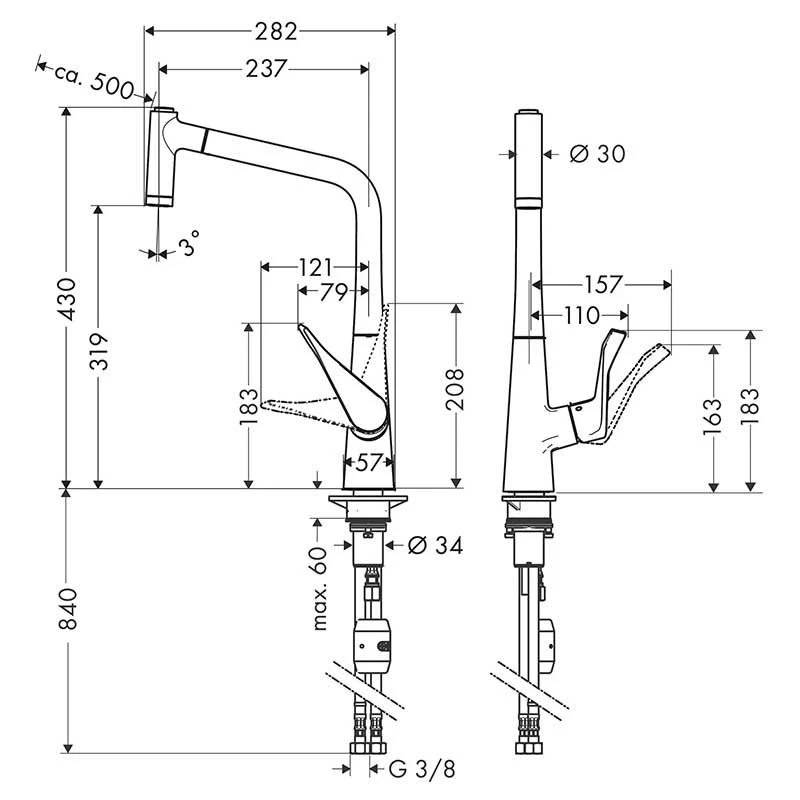 - Swivel spout adjustable in 2 steps to 110Β° or 150Β°