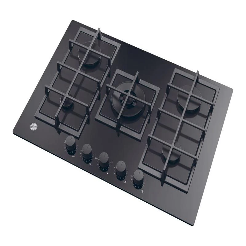 Elevate your kitchen with the Hoover HVG74WC5B Gas on Glass Hob. Crafted in sleek black tempered glass, this hob adds a touch of classy style to your kitchen appliances, featuring black burners that provide an elegant touch.
